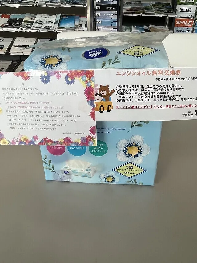 お客様にエンジンオイル無料交換券を1枚(発行から一年間有効です。)とティッシュをプレゼントさせていただきます。